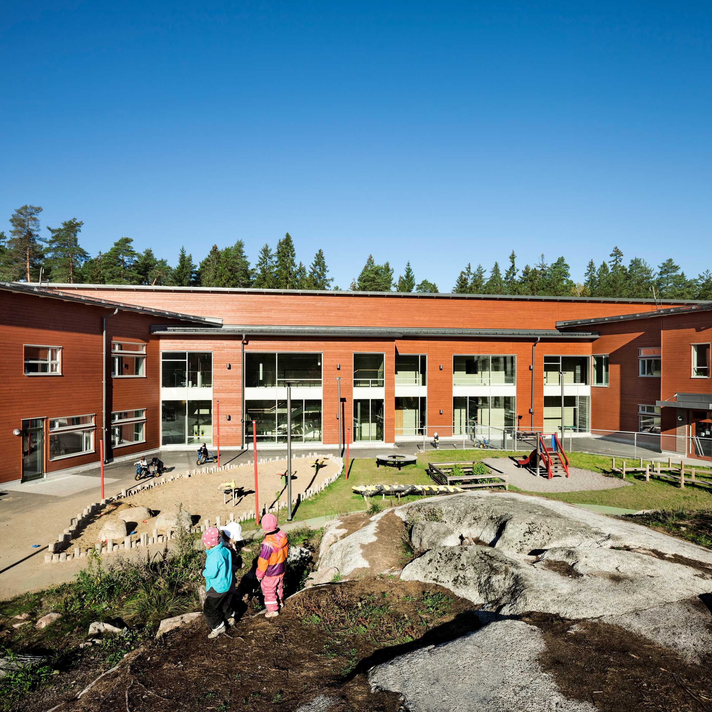 Tengbom’s commission was to create a spatial programme for a school accommodating just over 300 pupils, with the principal requirement that the building should easily adapt to future needs. At the same time, a study was conducted regarding the potential development of an untouched forest area in Alsike. The client’s wish was for a school with strong architecture and warmth, harmoniously integrated into this specific natural setting. The result is Brännkärrsskolan.