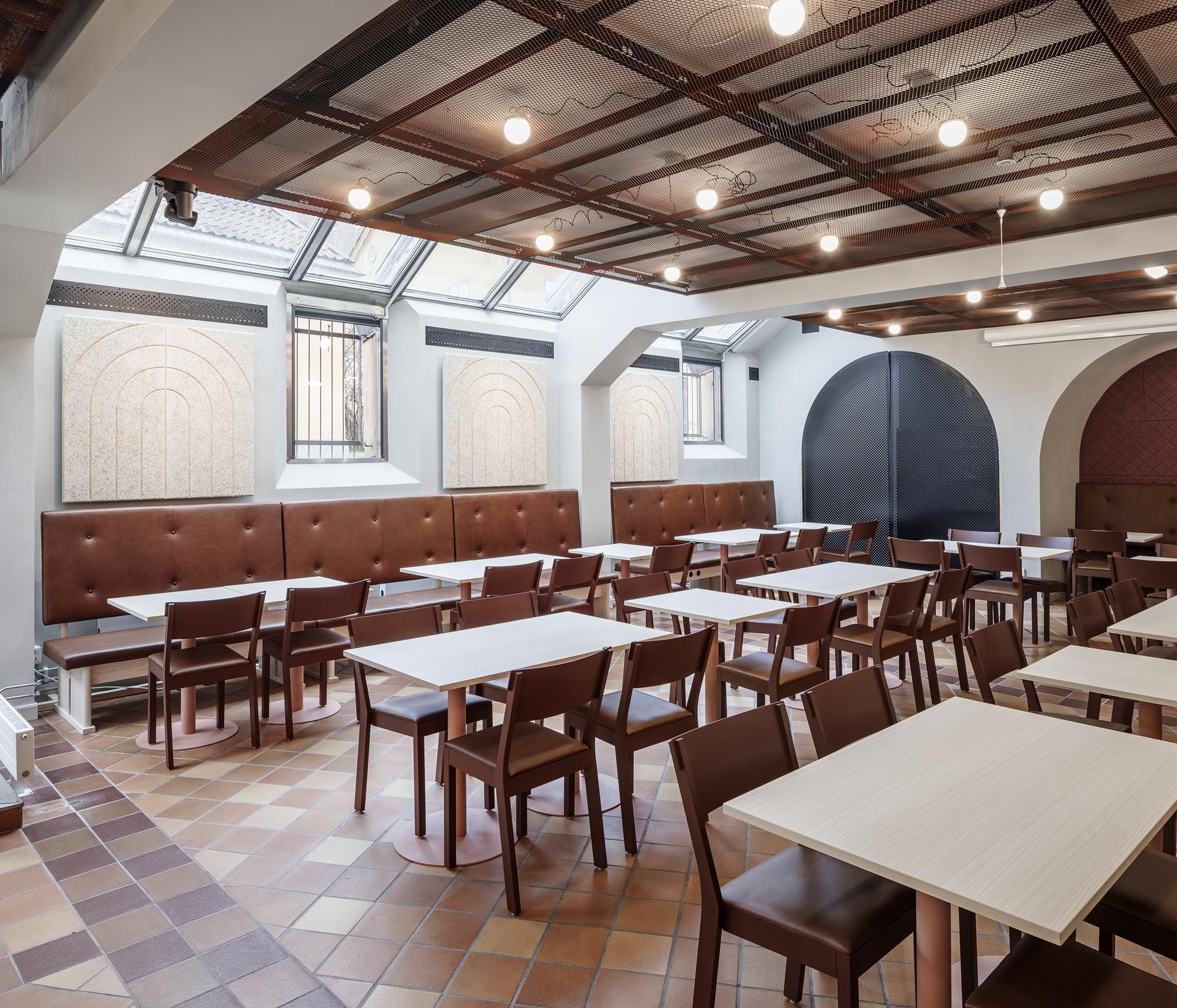 The material palette is both practical and poetic, with reuse as a natural foundation. A large portion of the furniture has been given new life, strengthening both sustainability and the sense of continuity. To achieve a harmonious whole among the various reused tables, we developed a special tabletop tray for technical equipment — a simple, unified expression inspired by the form language of the hymn board.