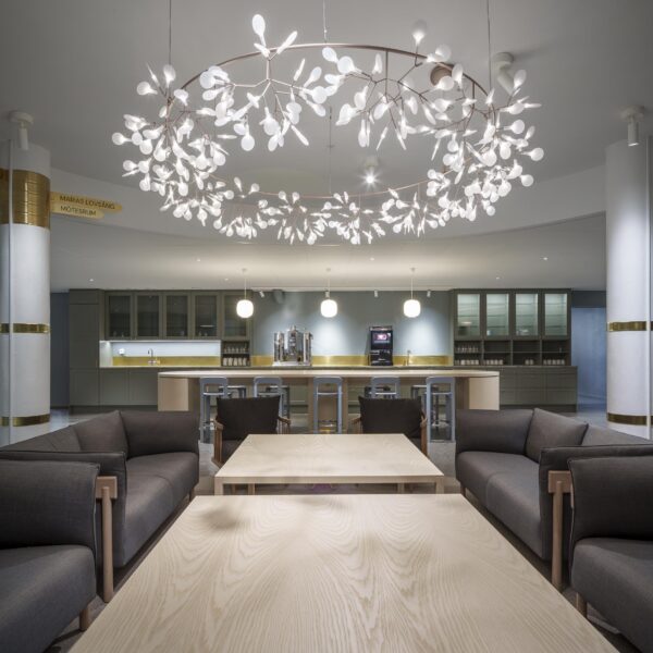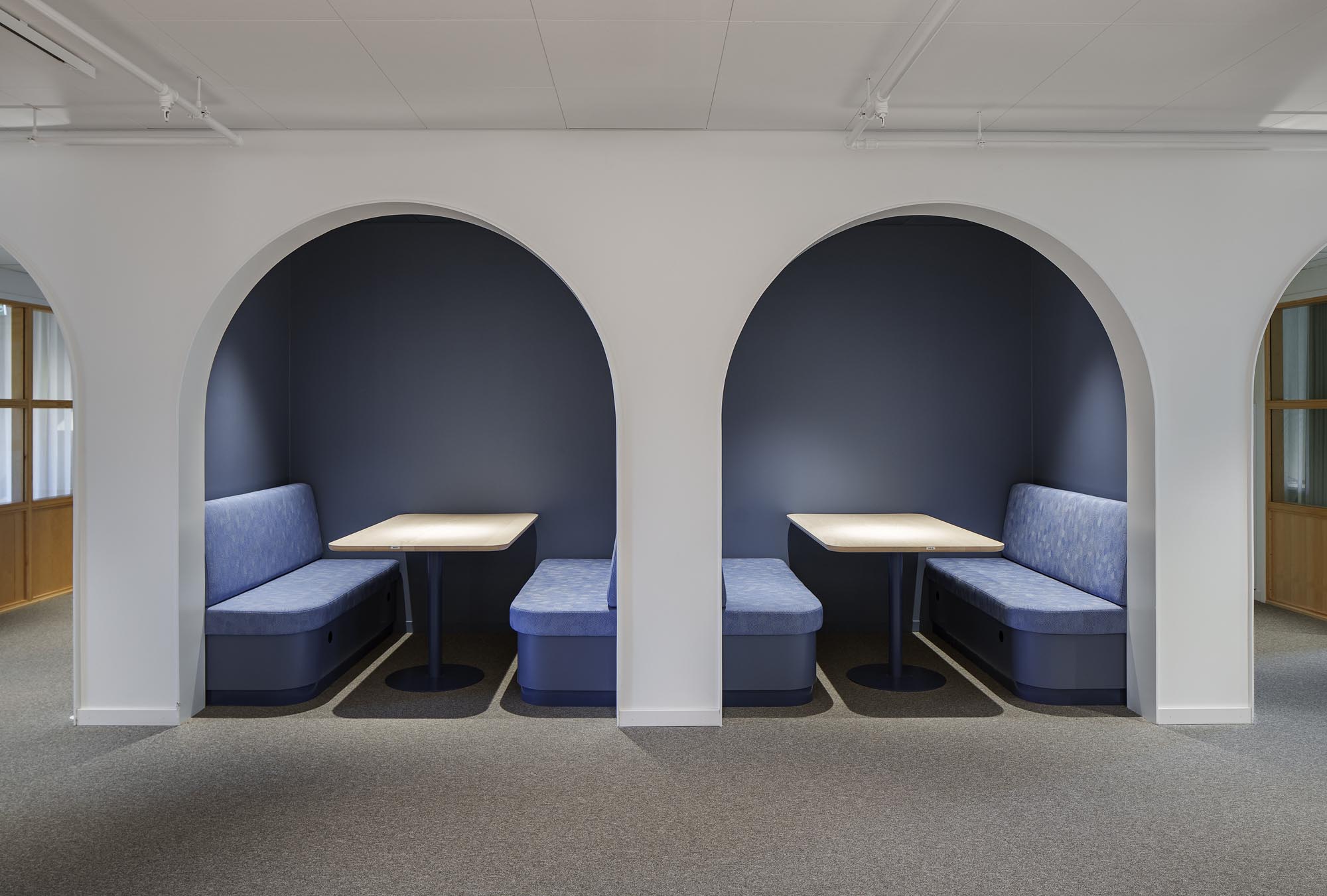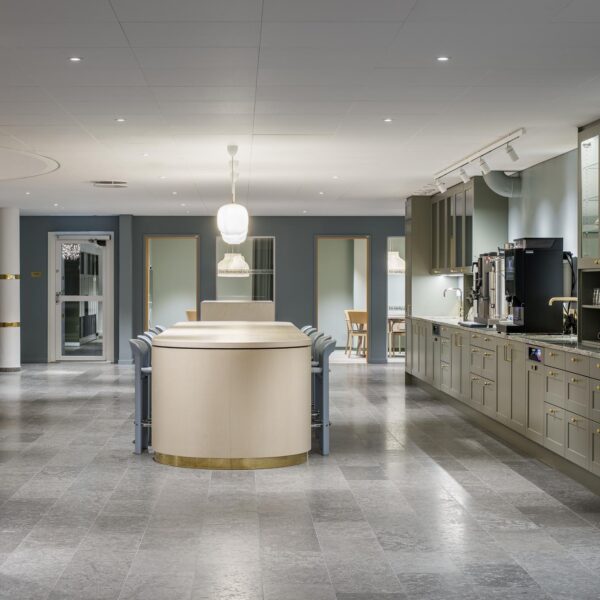 At the center of the building lies the glazed cloister garden – a threshold between indoors and outdoors. The greenery and daylight create an important heart for the building, perfect for meetings, pauses, and conversation. We also designed the lounges and coffee stations to encourage moments of connection and informal exchange, using warm materials and attention to detail.