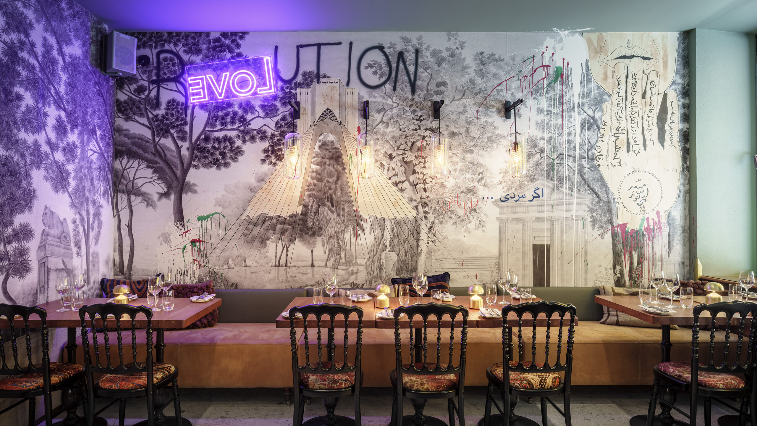 Food was the starting point when Tengbom crafted the interior for the new Persian restaurant Coup d’état in Östermalm, Stockholm. Just as classic saffron rice, lamb, and aubergine purée meet modern oysters with sorbet and an extensive cocktail list, the interior reflects the loving palace coup. Persian green meets neon and street art.
