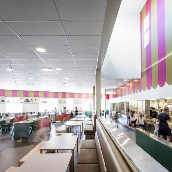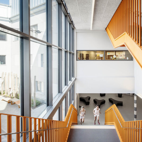 Externally, the school is both strict and playful, a design approach that also defines the interior concept. Just as the school appears different from various distances, the interior scale also shifts. A variety of room shapes create spaces that foster safety, community, playfulness, and inspiration. We carefully chose the materials, both inside and out, to ensure they endure and improve over time.
