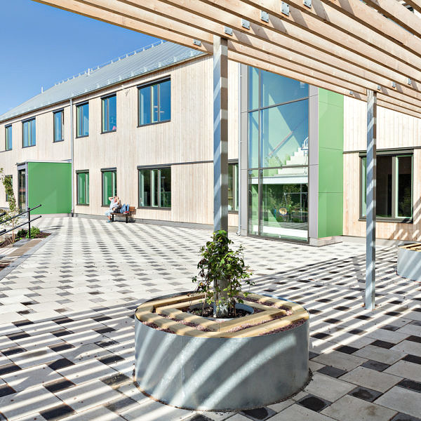 These simple yet robust agricultural buildings are everywhere on Öland—solid wooden walls and pitched steel roofs. We embraced the traditional design but introduced new ideas. The facade, made of high-quality pine, is treated with Sioo, an eco-friendly finish that quickly gives the wood a light grey tone. Large windows let in plenty of daylight and create a sense of transparency. As a nod to its name, Smaragdskolan also features green accent colours at the entrance and in the stairwells.
