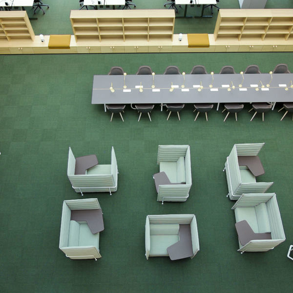 Every detail in the large office in Sundbyberg was carefully designed. To create the right atmosphere, our product designers developed custom-made solutions that balanced function and aesthetics. As the project progressed, several new products took shape. Morgana received the conference table Link, designed to enhance both collaboration and flexibility. Offecct introduced Focus Divider, a sound-absorbing workstation that creates small rooms within the room, improving both privacy and acoustics. Meanwhile, the team designed the light fixture Hätta for Örsjö, adding a warm and inviting touch to the space.
