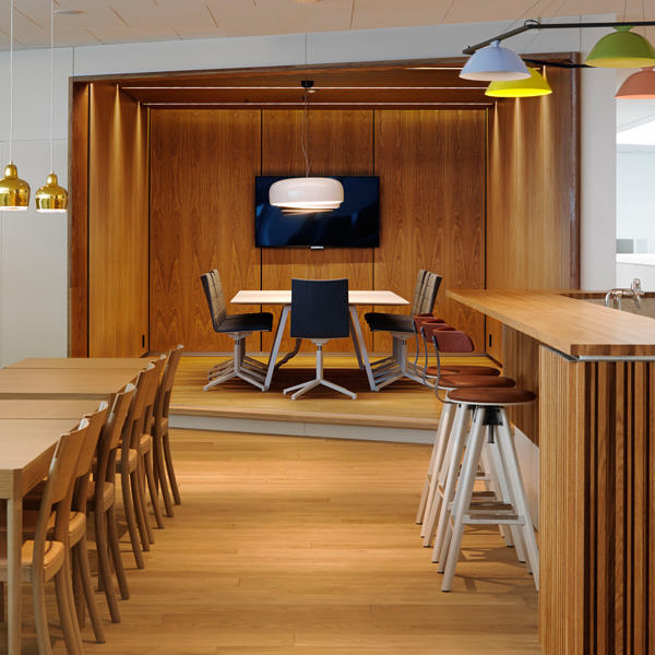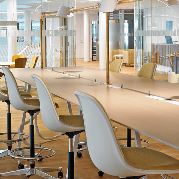 In 2014, Swedbank’s new head office covering a total of 45,000 m2 was opened in Sundbyberg. During a four-year period, we developed the interior environments of the offices based on the vision of an active and vibrant place for meetings. The interior design in the inspiring and energetic office was to reflect the three basic key words of the bank: open, simple and caring.