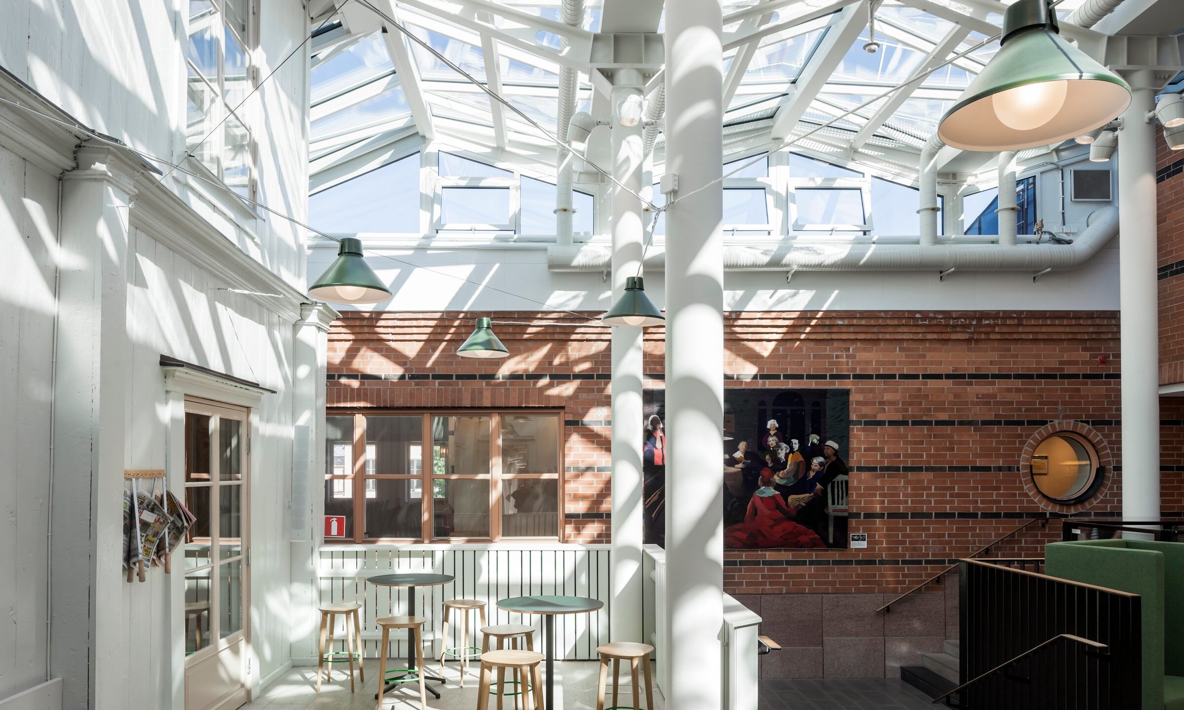 “We worked with wood interiors to retain the cozy and warm atmosphere, using white-stained wooden slats, panels, and glulam beams,” says architect Håkan Albeman. “The exterior façades of the older houses remain visible as interior walls. And despite the large glass surfaces, we managed to create a good acoustic environment.”